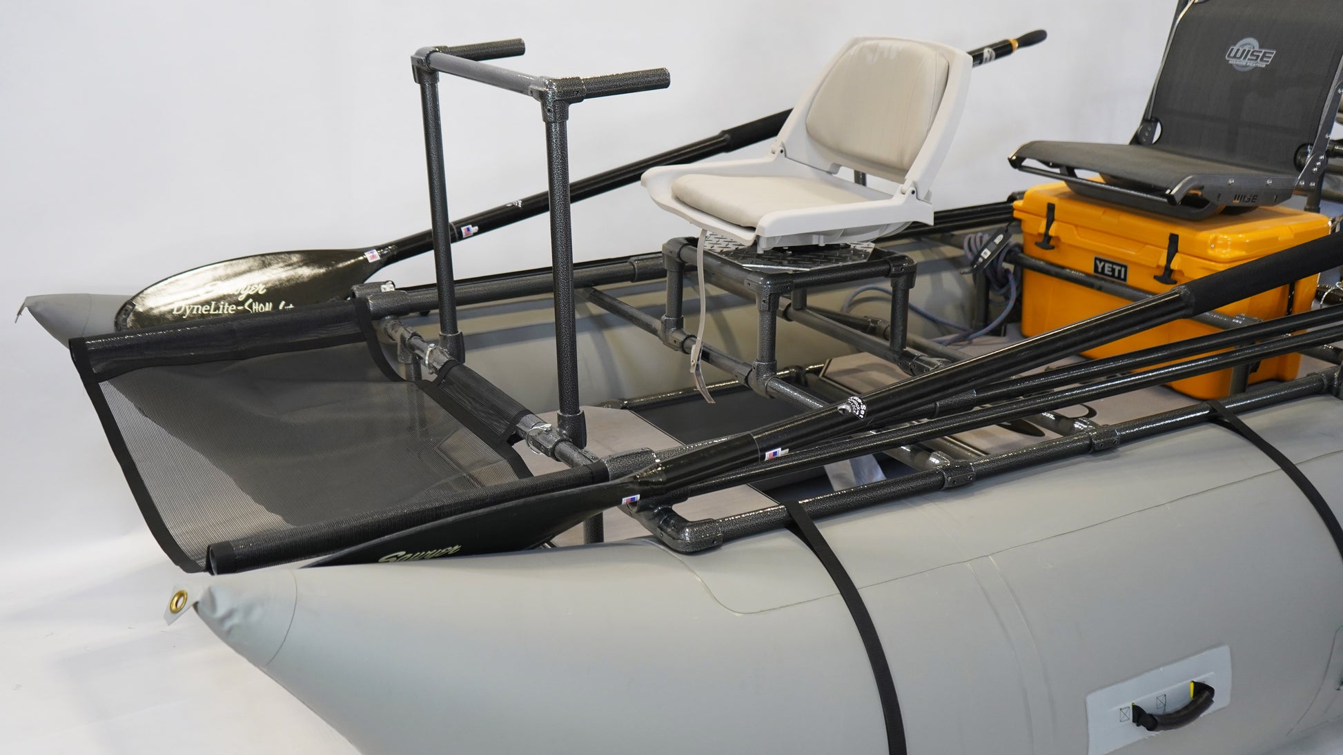 Equipped with 9' Sawyer MXS Oars and Shoal-Cut Blades, a 35lb anchor, and a 4-rod holder system, this frame is purpose-built to enhance functionality, comfort, and durability. While larger and heavier than its smaller counterparts, the Hydro-Slay Guide offers unmatched strength and capacity, making it the perfect choice for those who need high performance in demanding environments.