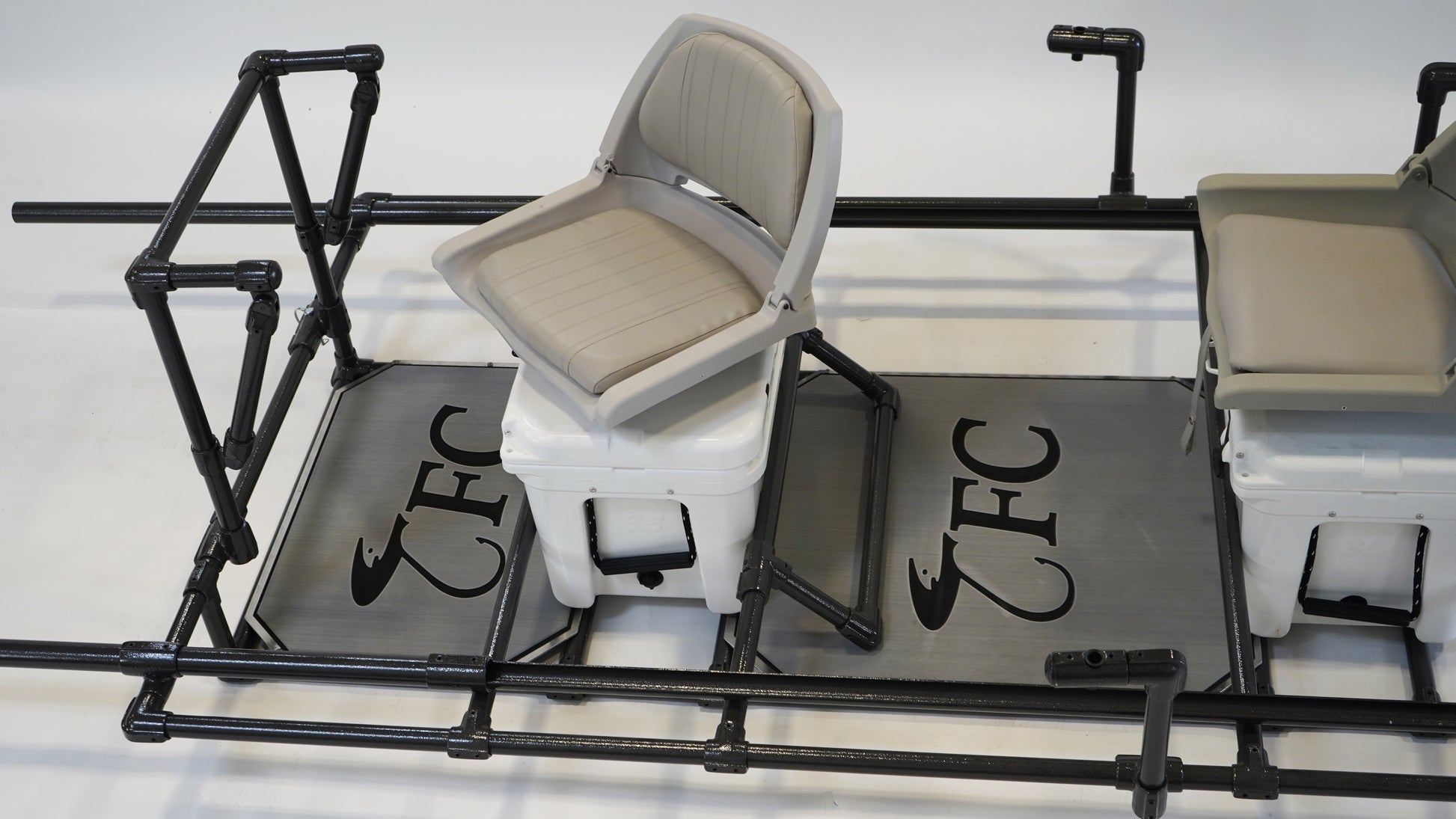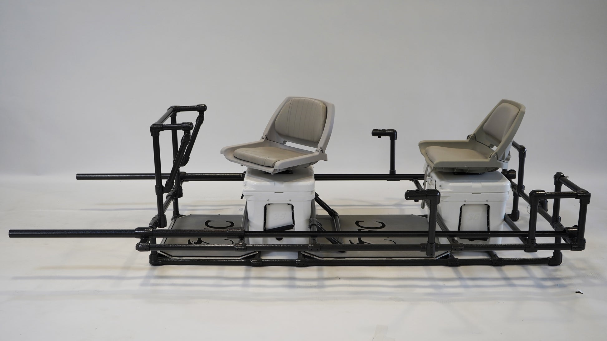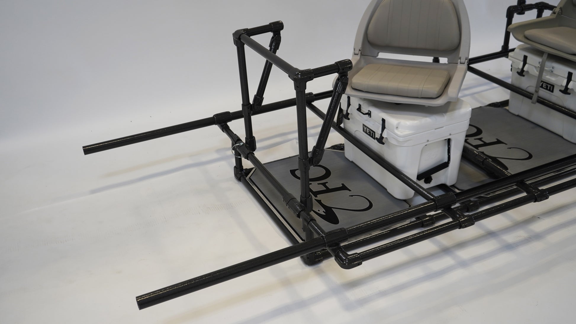 Our Hydro-Slay Twin Pro Base frame is the perfect frame for exploring new water and accessing hard-to-reach areas.This frame prioritizes comfort and functionality while preserving the signature lightweight design and maneuverability that define our two-man catarafts.The Yeti Cooler Seats offer maximum comfort while providing a great rowing experience and storage. The Diamond Plate standing platforms deliver a strong, stable foundation, while the Seadek enhances comfort in warmer months and minimizes ice buildup during colder seasons. The TFC Custom Dual Rod Holder System comes standard on all of our two/three man frames and also provides anglers with a convenient way to grab and carry this craft.
