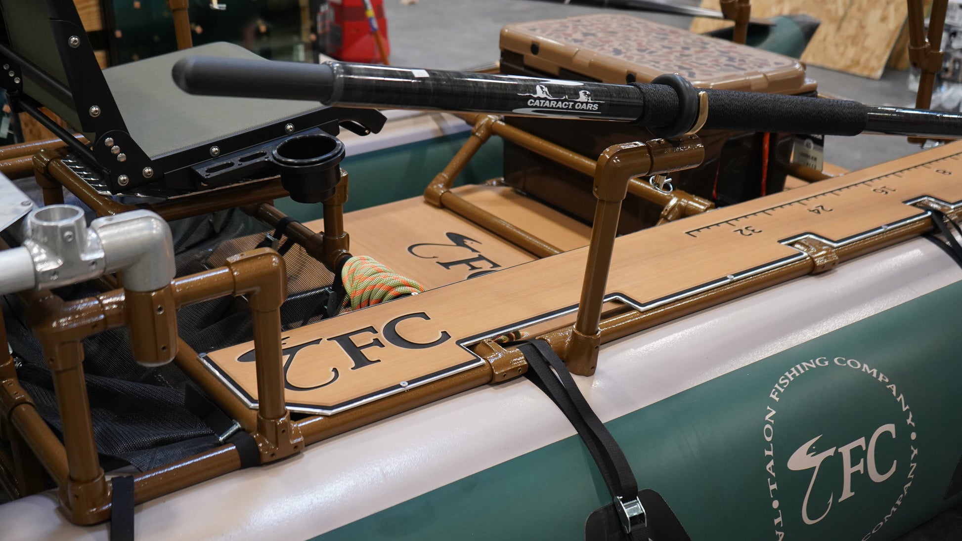 Our All-New Two-Man Model. Rod Holders are on one side facing backwards for front angler access which create space on the opposite side for an access platform with SeaDek. This new access platform system allows the angler and rower to easily get in and out of boat or swap seats on the water. This access platform can also be added to a three man guide. Includes a front Yeti Cooler (seat can be added), leg locks, anchor system, SeaDeked Diamond Plate Standing Platforms, and a set of 8.5' Sawyer or Cataract Oars. Rear Gear Rack and Rear or Front Motor Mounts can be added. Call or text 720-984-5041 for more info.